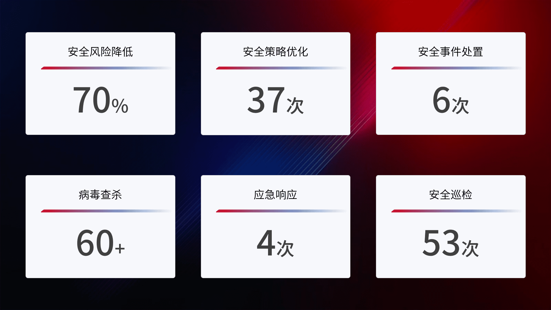 提供全面的安全事件报告体系,,,,包括处置报告、、周报、、、季度和年度总结,,,,结合持续监控,,,,帮助客户深入了解网络安全状况。。
